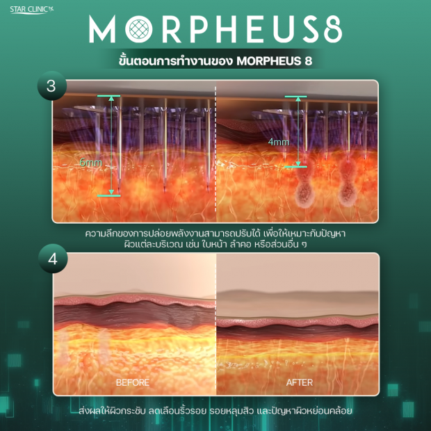 Morpheus8 เป็นการผสานระหว่าง Microneedling และ Radiofrequency (RF) ที่ทำงานร่วมกันเพื่อลดเลือนริ้วรอย กระชับผิว และปรับสภาพผิวให้ดูอ่อนเยาว์ โดยเทคโนโลยีนี้สามารถลงลึกไปถึงชั้นใต้ผิวหนังมากกว่าเทคโนโลยีทั่วไป ทำให้ผลลัพธ์เด่นชัดและยาวนาน